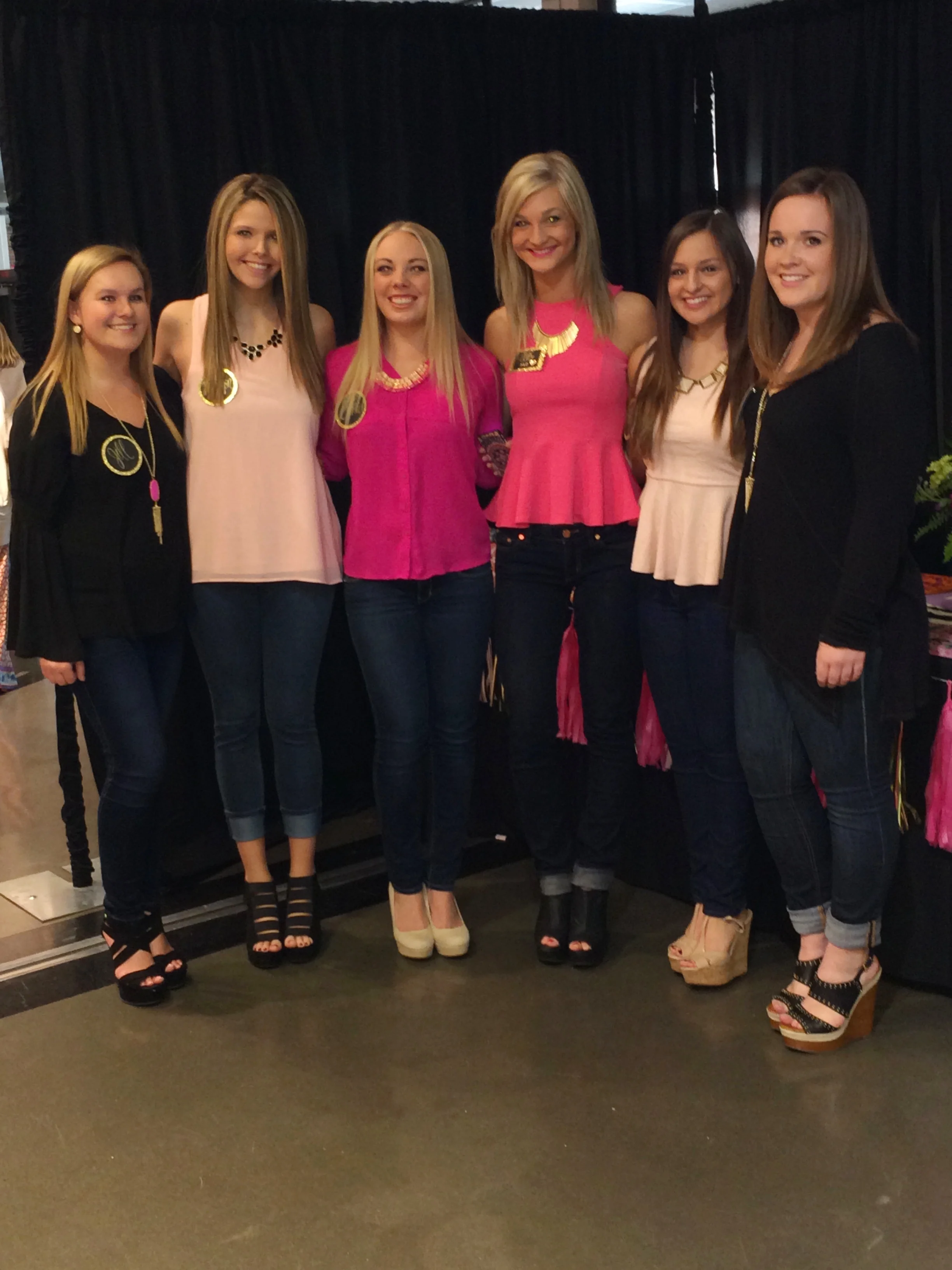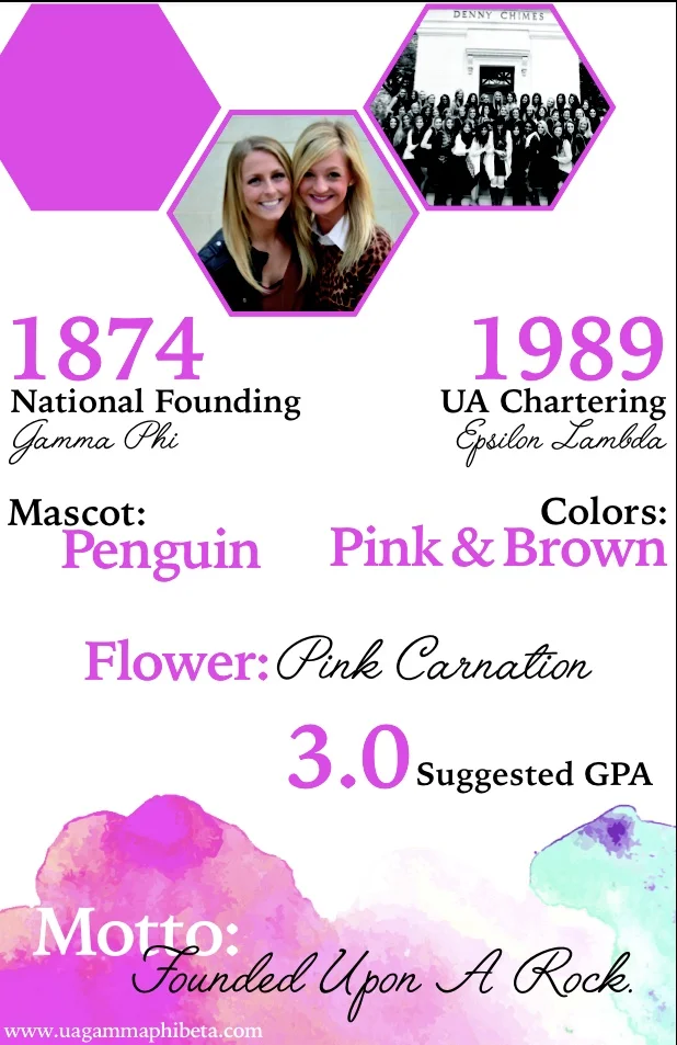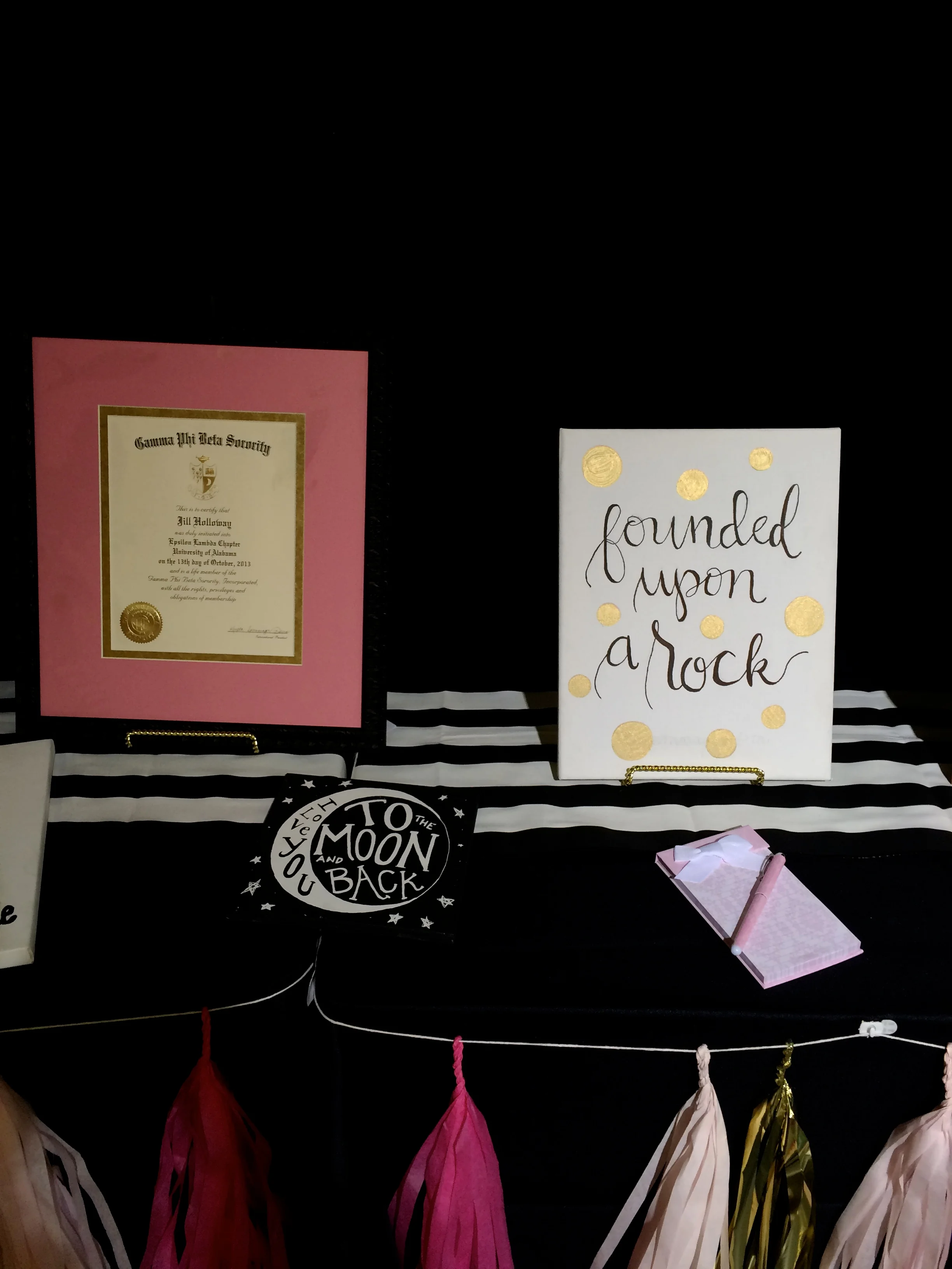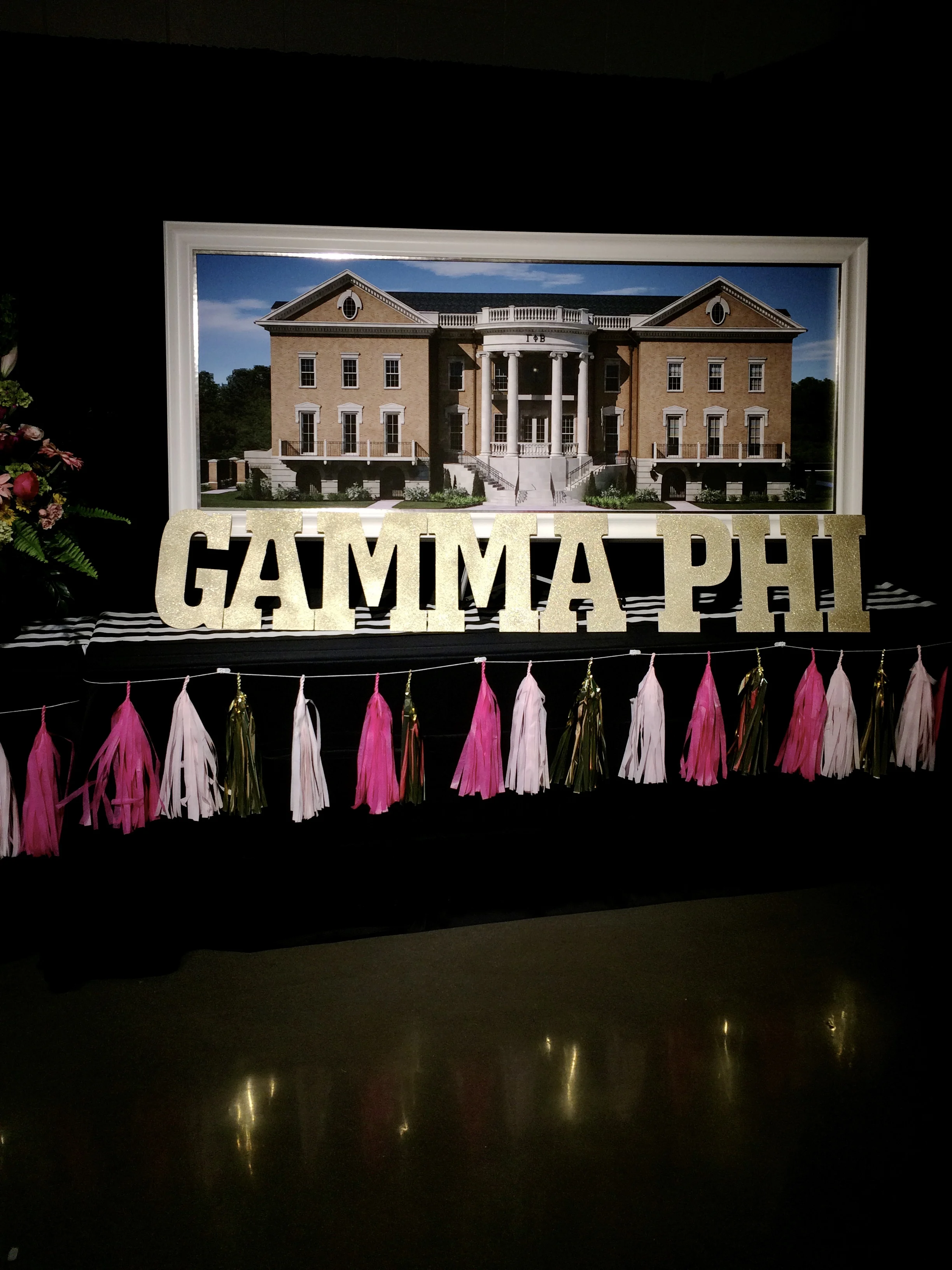 My vision for Gamma Phi's Preview Day table was similar to a Kate Spade 'Cocktail' Hour. Selected members met with nearly 2,800 high school senior women. Members wore a variety of pink and black tops with gold accented jewelry to represent Gamma Phi's national colors. The informational tables included: a large framed photo of the new Gamma Phi Beta house on-campus in which was completed months before recruitment week, two large floral arrangements of spring flowers, artwork created by chapter members, various Alabama greek signature game day t-shirts, and my own informational tri-fold poster giving the attendees a glimpse of life as a GPhi!