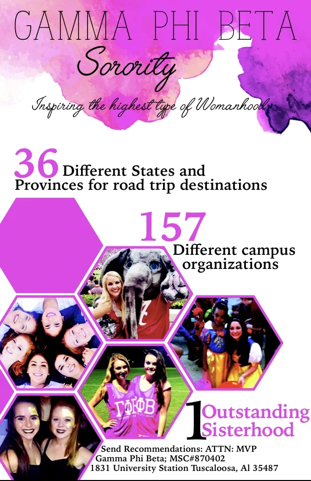 In November 2014, I was elected as 2015 Membership Vice President (MVP) position of the Epsilon Lambda chapter of Gamma Phi Beta at The University of Alabama. I was appointed this leadership role by the UA, Epsilon Lambda chapter alumni board. My position was a part of the active chapter's executive board and focused solely on membership status. As a member of the 2015 executive board, some of our obligations included: participation in twice a week exec meetings, bi-weekly executive board hearings, leading weekly chapter meetings, and monitoring all social events.
